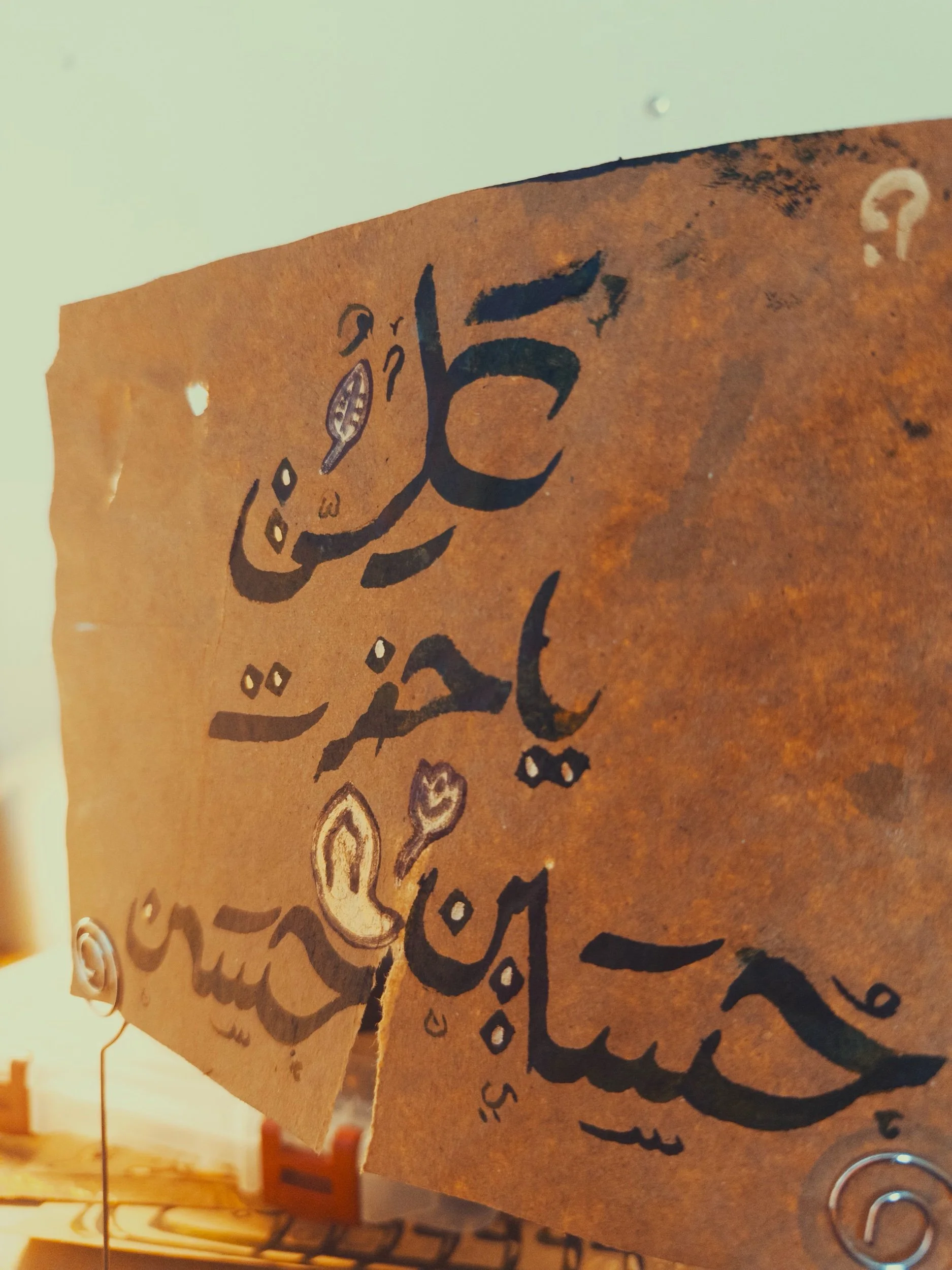 This calligraphy features the names of Hazrat Ali, Hussain and Hassan. The calligraphy is drawn in green ink with gold accents. Fully original 1 Of 1.
